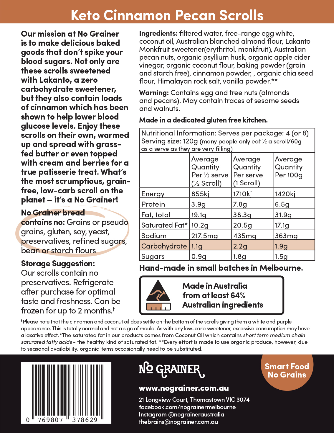No Grainer Keto Cinnamon & Pecan Scrolls are sweetened with lakanto monkfruit sweetener, so there’s there’s less than 3 grams of carbs per scroll. They are also 100% grain, gluten, yeast, preservative & dairy free.