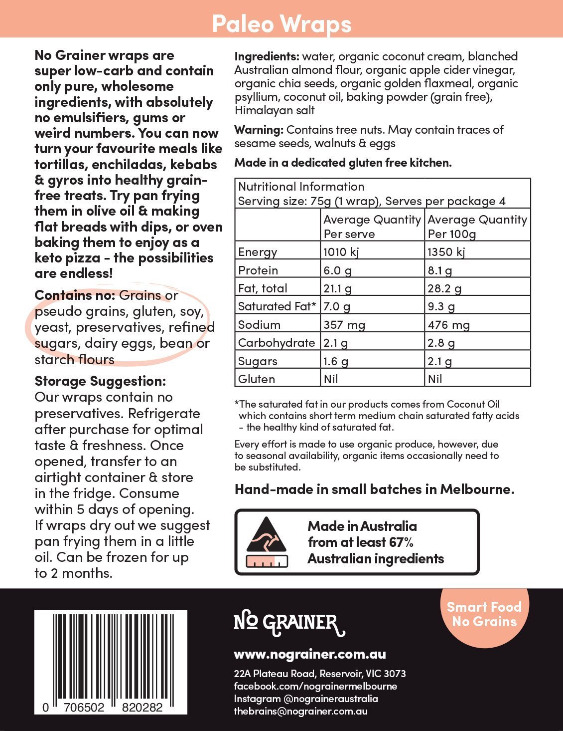 No Grainer Paleo Wraps are perfect for anyone following a gluten-free, keto or Paleo diet. They are super low-carb and contain only pure, wholesome ingredients, with absolutely no emulsifiers, gums or weird numbers.