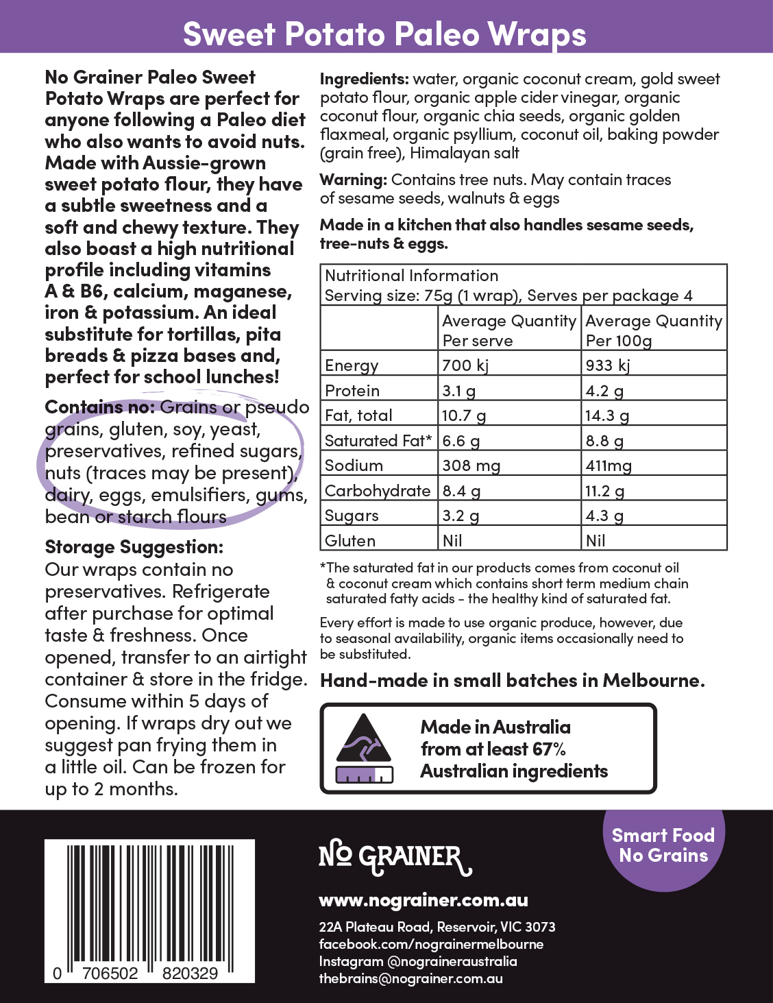 The wraps are made using premium Natural Evolution Sweet Potato Flour that is grown solely in Far North Queensland. It has an impressive nutrient profile containing significant amounts of magnesium, vitamin A, C & E.